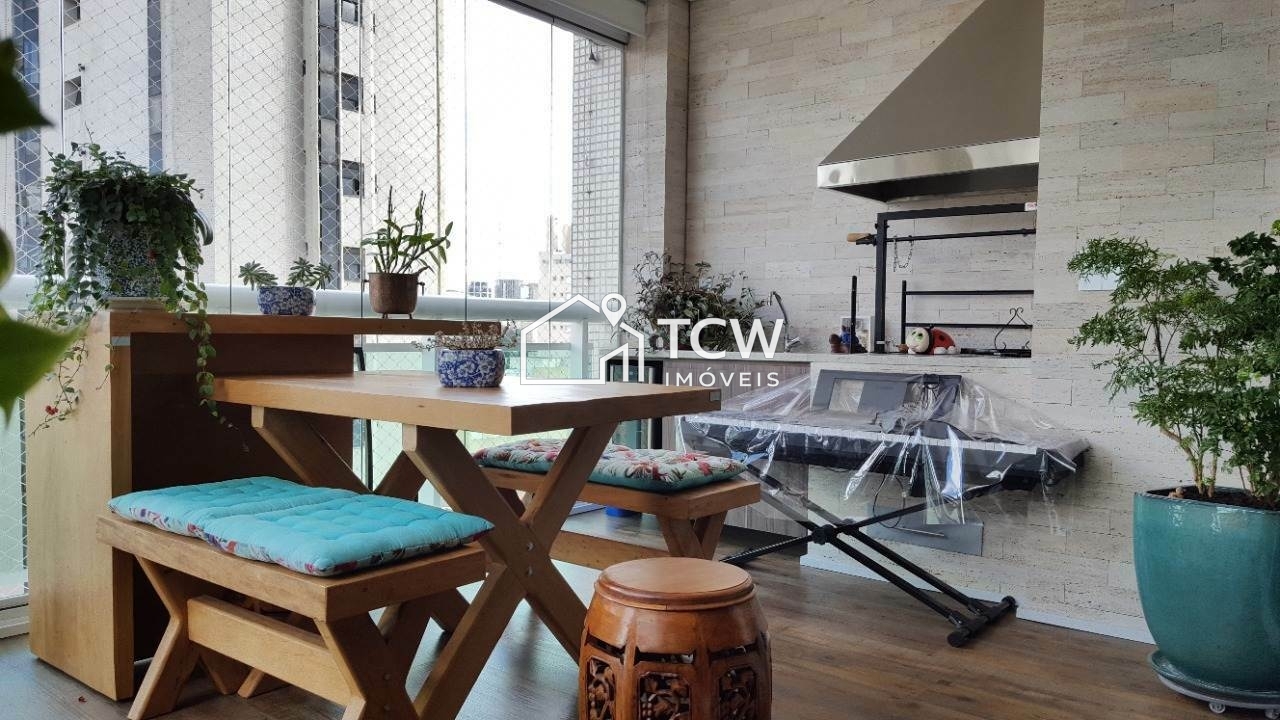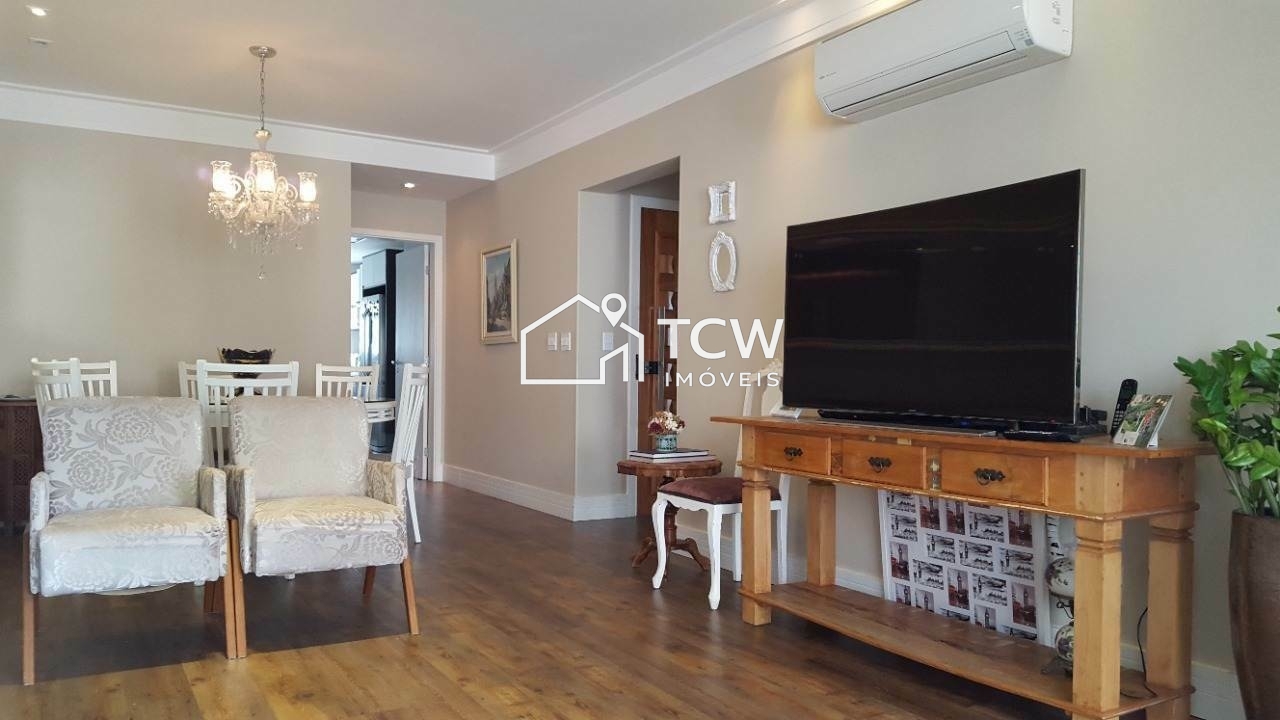 # 158m2, 3 suítes, Lavabo, Living com Varanda Gourmet, Sala de estar, Sala de jantar, Copa, Cozinha, Área de serviço, Dependência de empregada com W.C., Depósito privativo, 3 vagas de garagem determinadas