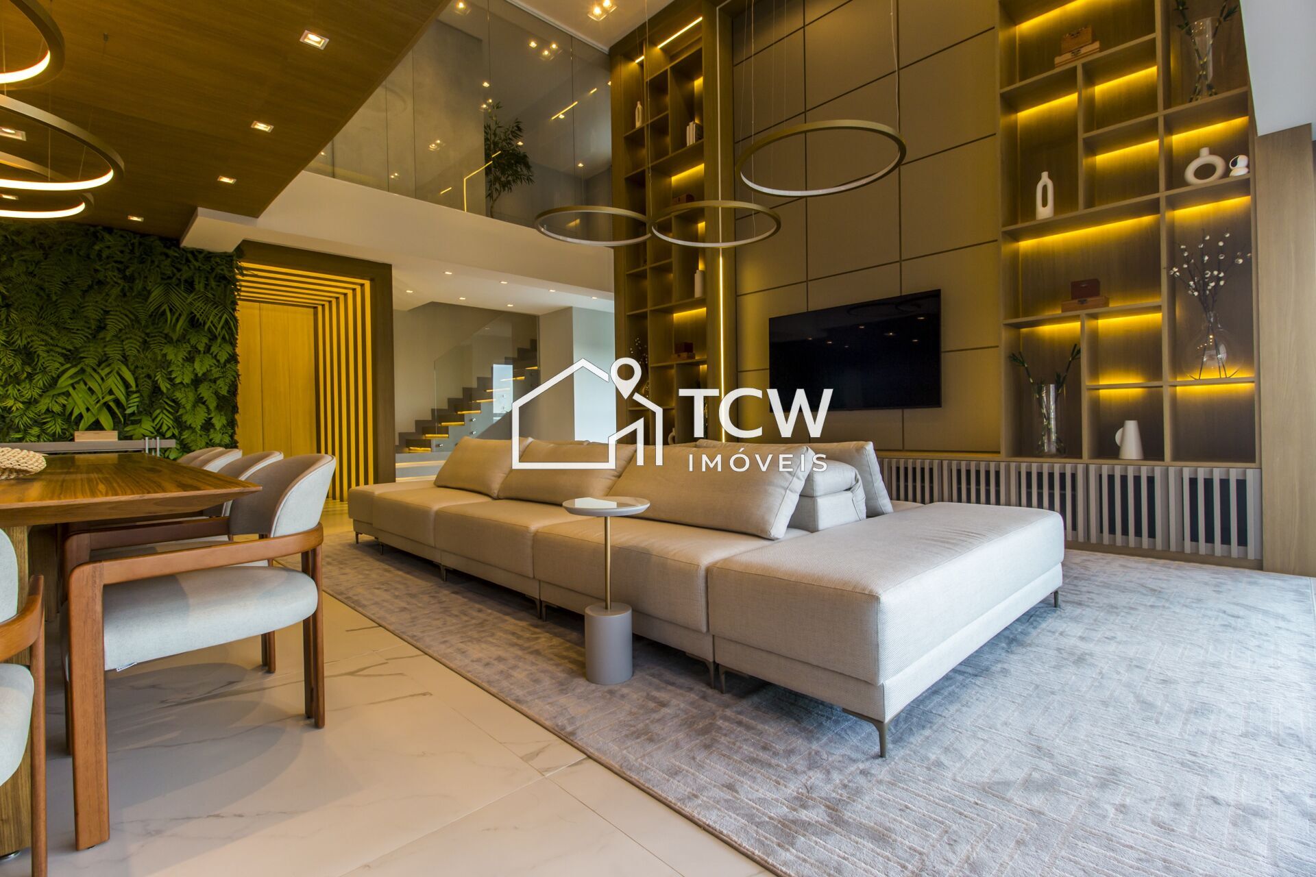 376m2, 3 Suítes espaçosas sendo 1 Suíte master, Home office, Hall social, Living com pé direito duplo, Mezanino, Lavabo, Sala de almoço, Sala de jantar, Cozinha, Despensa, Área de serviço, Depósito privativo amplo, 4 Vagas na garagem