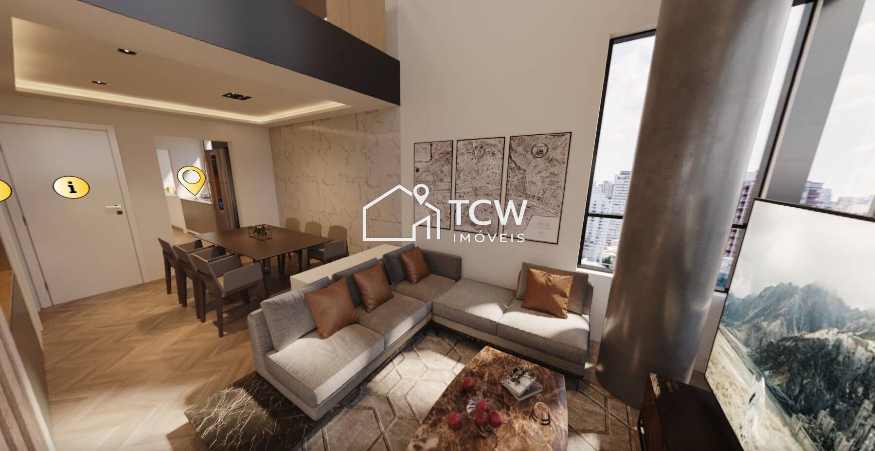 Apartamento Duplex de 91m2. Piso inferior: Living com pé-direito duplo integrado a sacada, Lavabo, Sala de jantar, Cozinha, Área de serviço. Piso superior: 2 Suítes. 01 Vaga na garagem