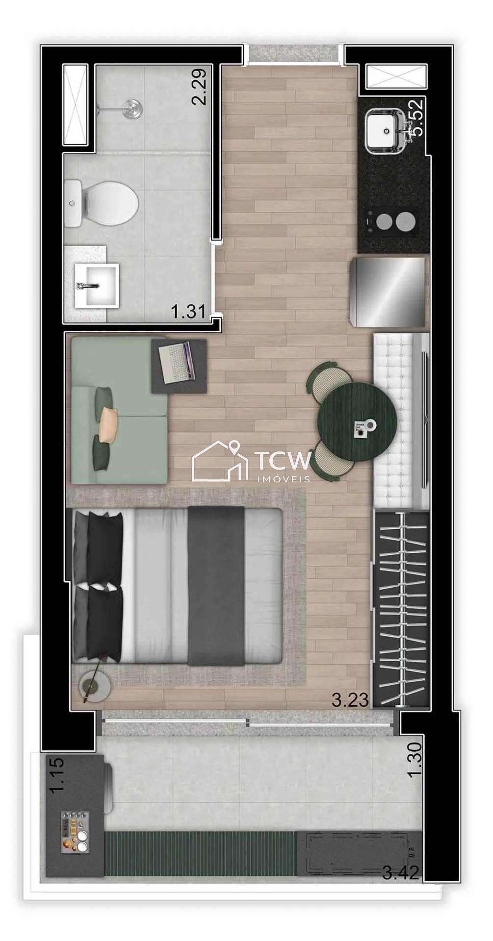 Studio com 26m2. 1 Dormitório, Sacada, Banheiro social, APA