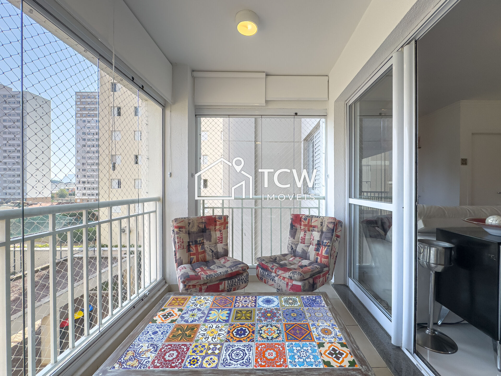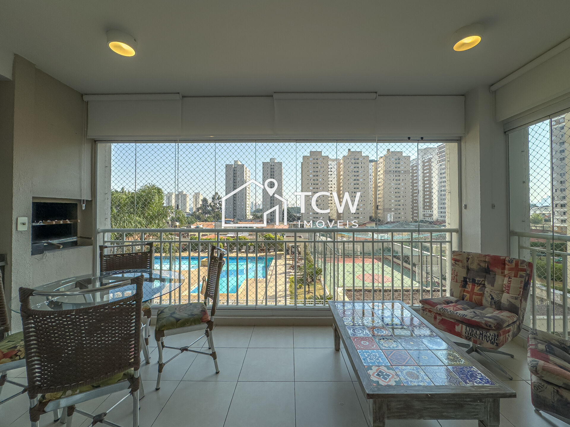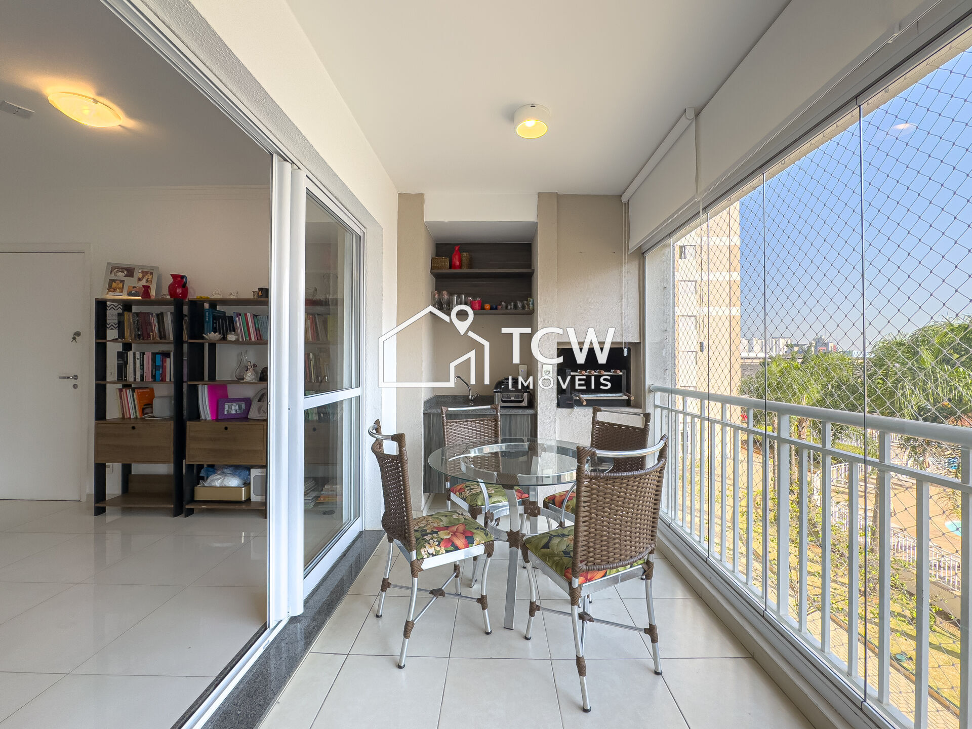 # Varanda gourmet com fechamento em vidro, persianas e redes de proteção