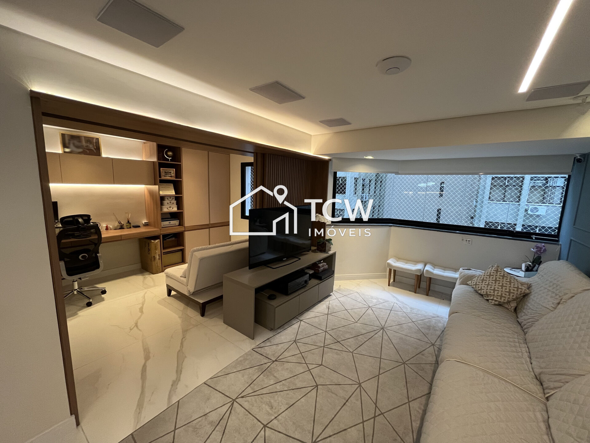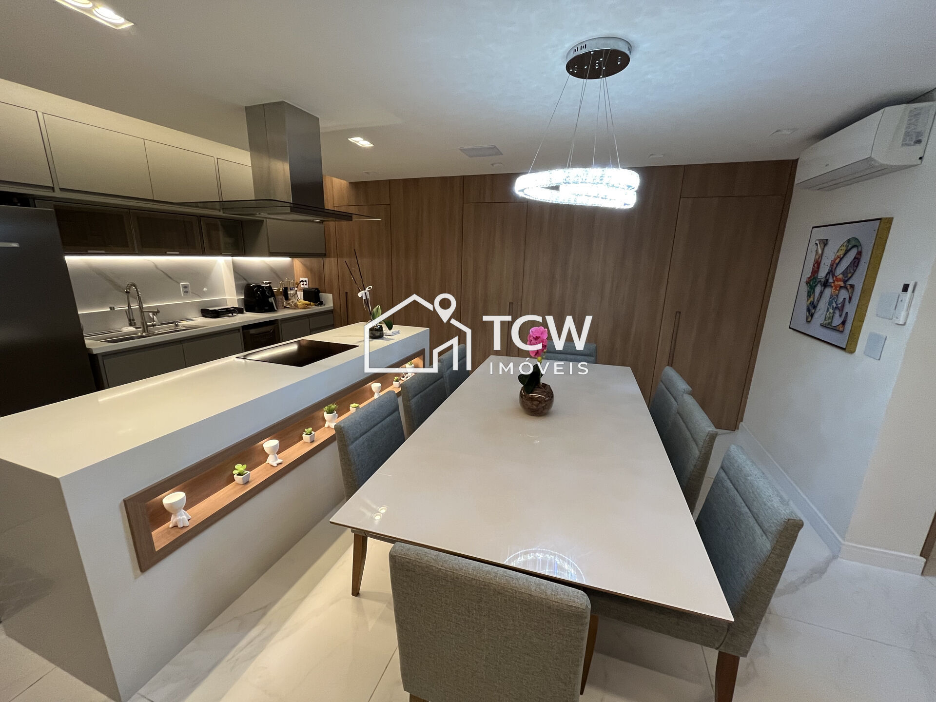 Ar-condicionado no living e suíte, automação de luzes e cortinas (Google Home/Livolo), som JBL embutido, espelhos em bronze, tomadas universais, fechadura eletrônica e móveis planejados em todos os ambientes.