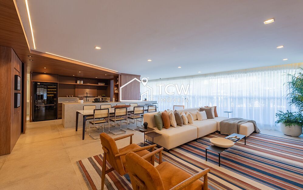 Apartamento com hall social, lavabo, living integrado à varanda gourmet, sala de jantar, cozinha com despensa e área de serviço com banheiro