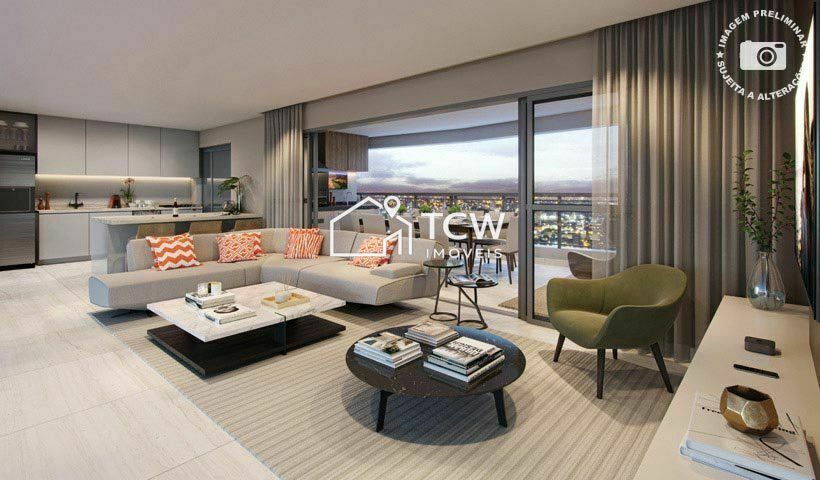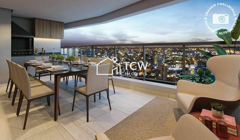 177m2, 4 Suítes, Lavabo, Hall social, Living integrado ao terraço gourmet, Sala de tv, Cozinha, Área de serviço com W.C., Despensa, 3 Vagas na garagem