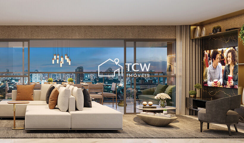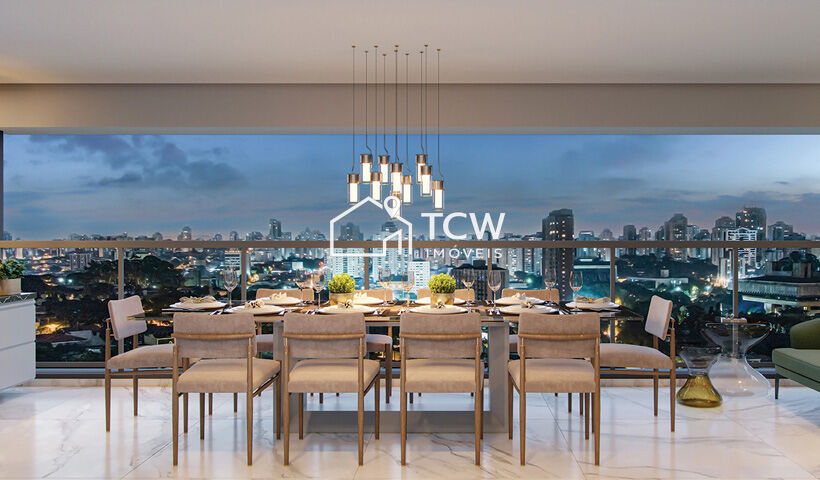 141m2, 3 Suítes, Hall social, Banheiro social, Lavabo, Living integrado ao terraço gourmet, Sala de jantar, Cozinha com W.C., Terraço de serviço, Depósito privativo no subsolo, 2 Vagas na garagem
