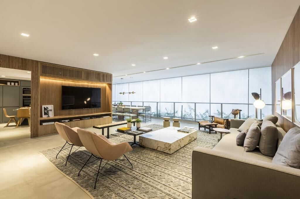 Apartamento com 268m2. 4 Suítes, Lavabo, Living integrado ao amplo terraço gourmet, Sala de tv, Sala de almoço, Sala de jantar, Cozinha, Área de serviço com W.C., 3 Vagas na garagem