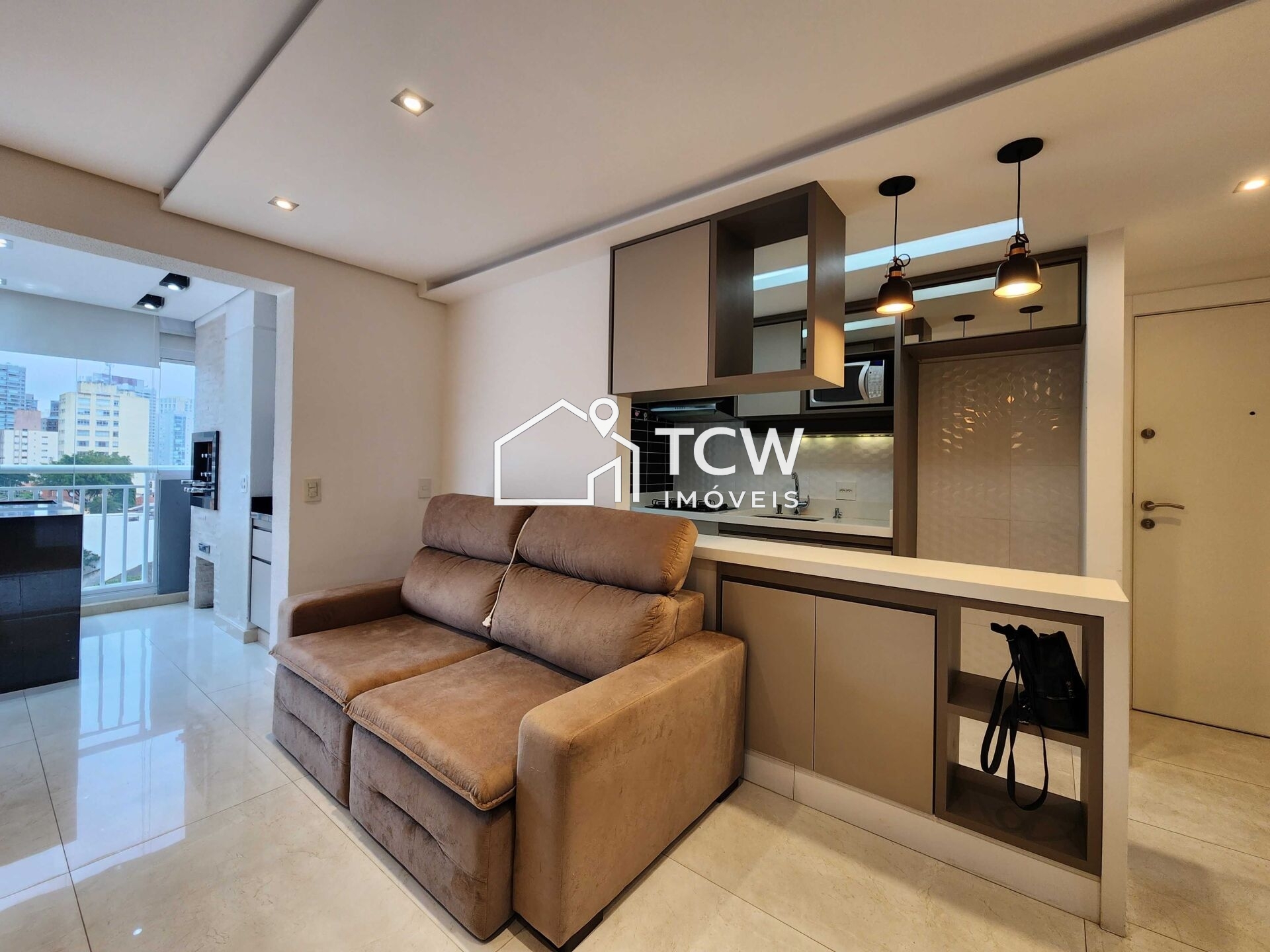 # 74m2, 1 Suíte com closet, Banheiro social, Living integrado ao terraço gourmet, Sala de jantar, Cozinha, Depósito privativo, 2 Vagas na garagem