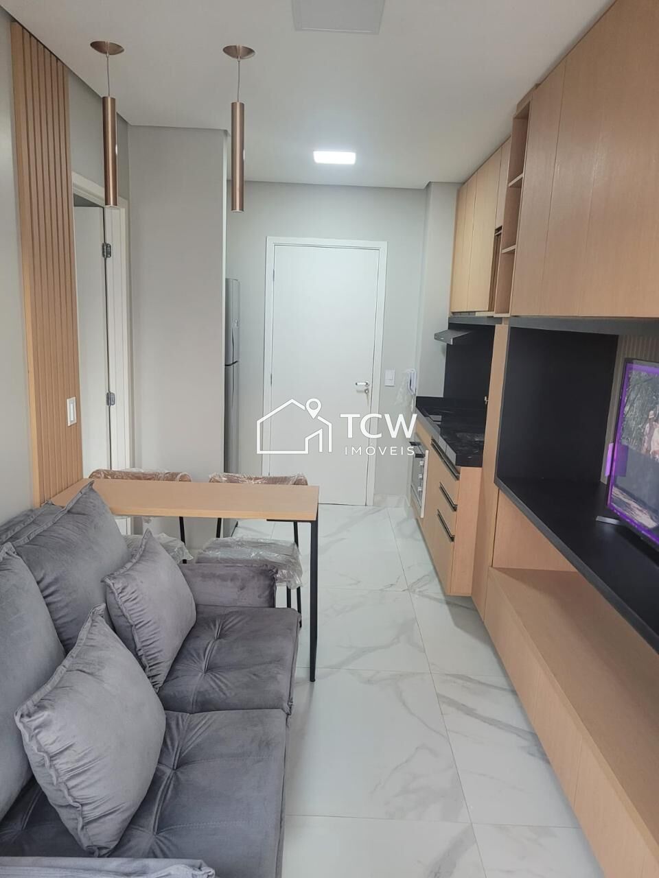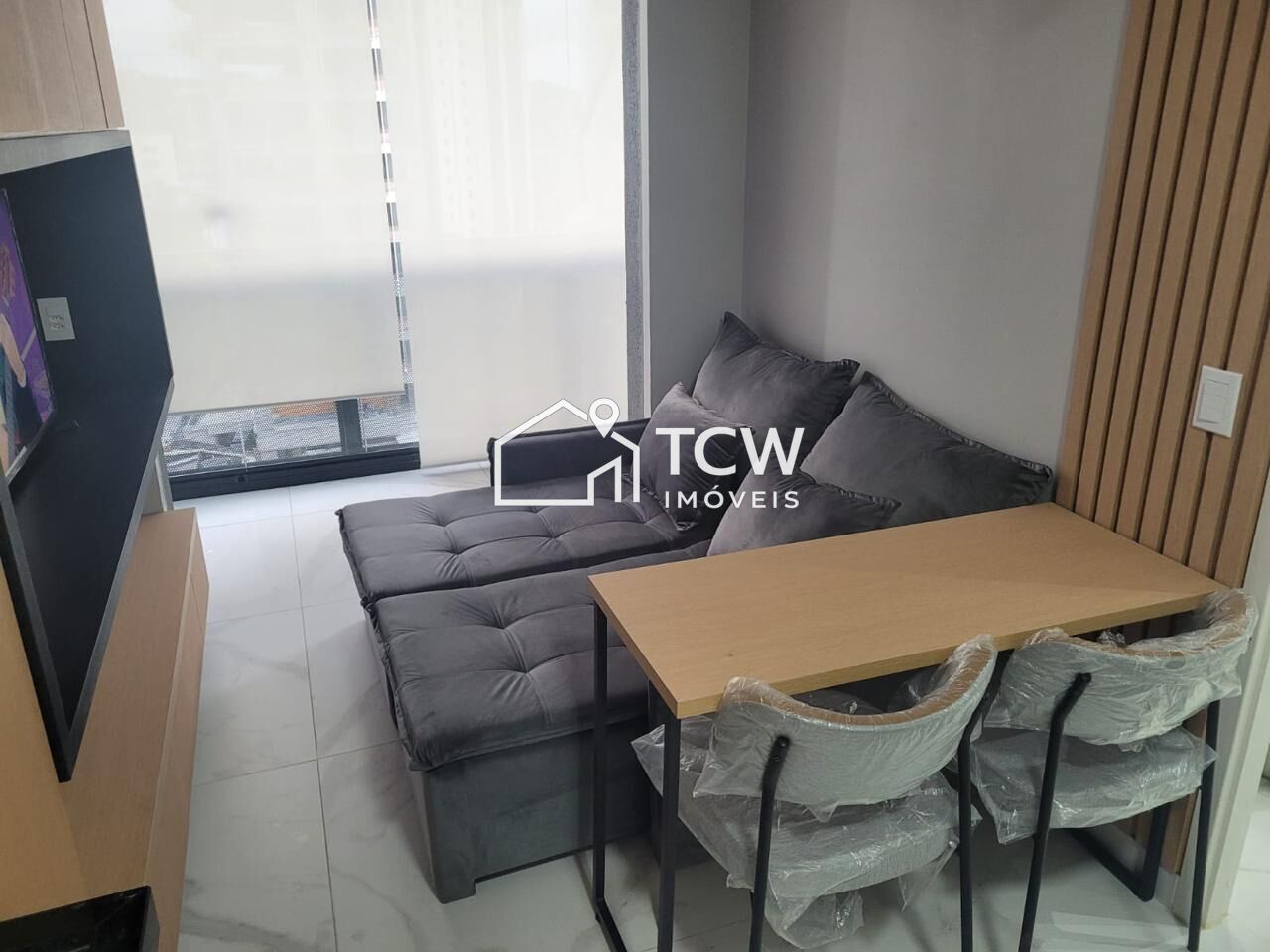 # Studio com 32m2. 1 Dormitório, Banheiro, Living com sacada, Cozinha, Área de serviço