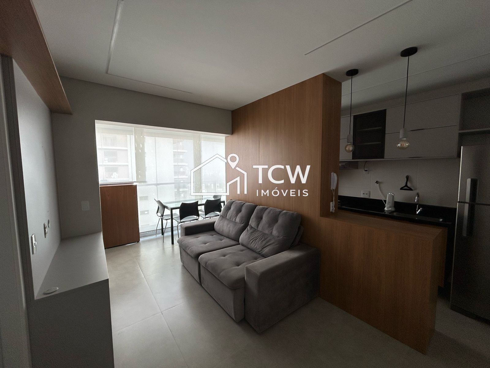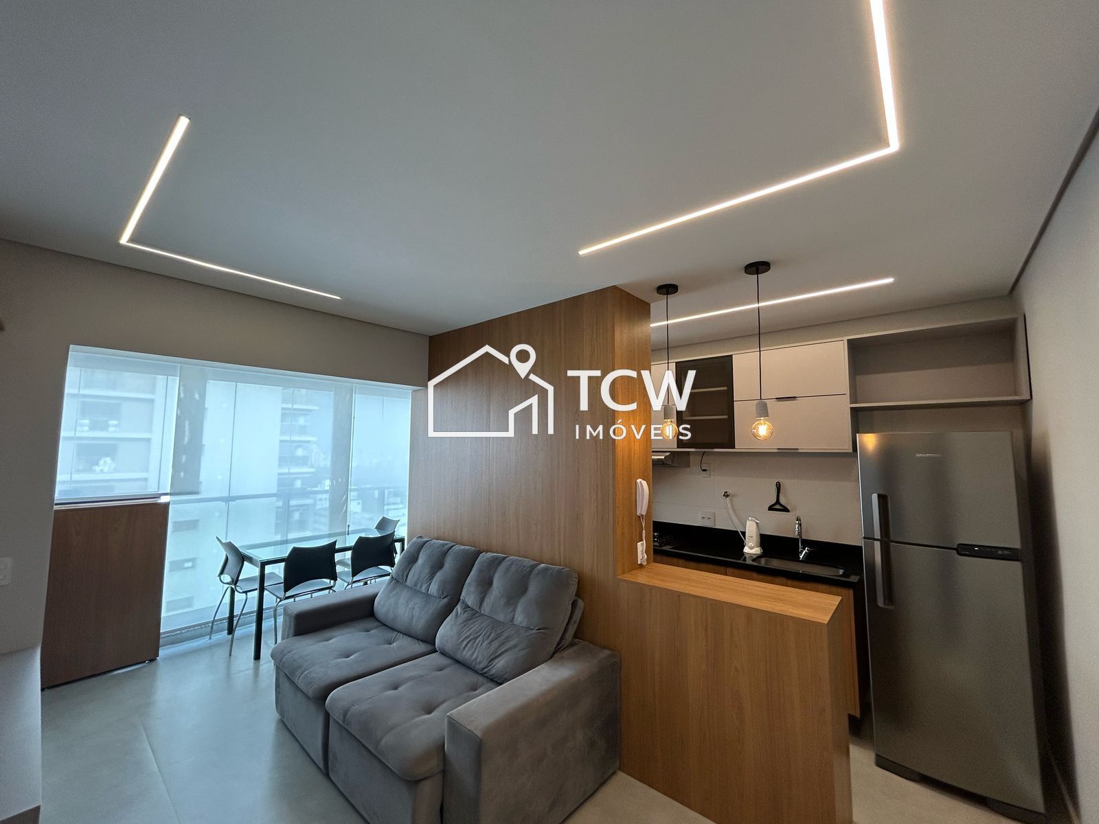 Apartamento mobiliado com 37m2, 1 Suíte, Banheiro, Living integrada a varanda, Cozinha, 1 Vaga na garagem