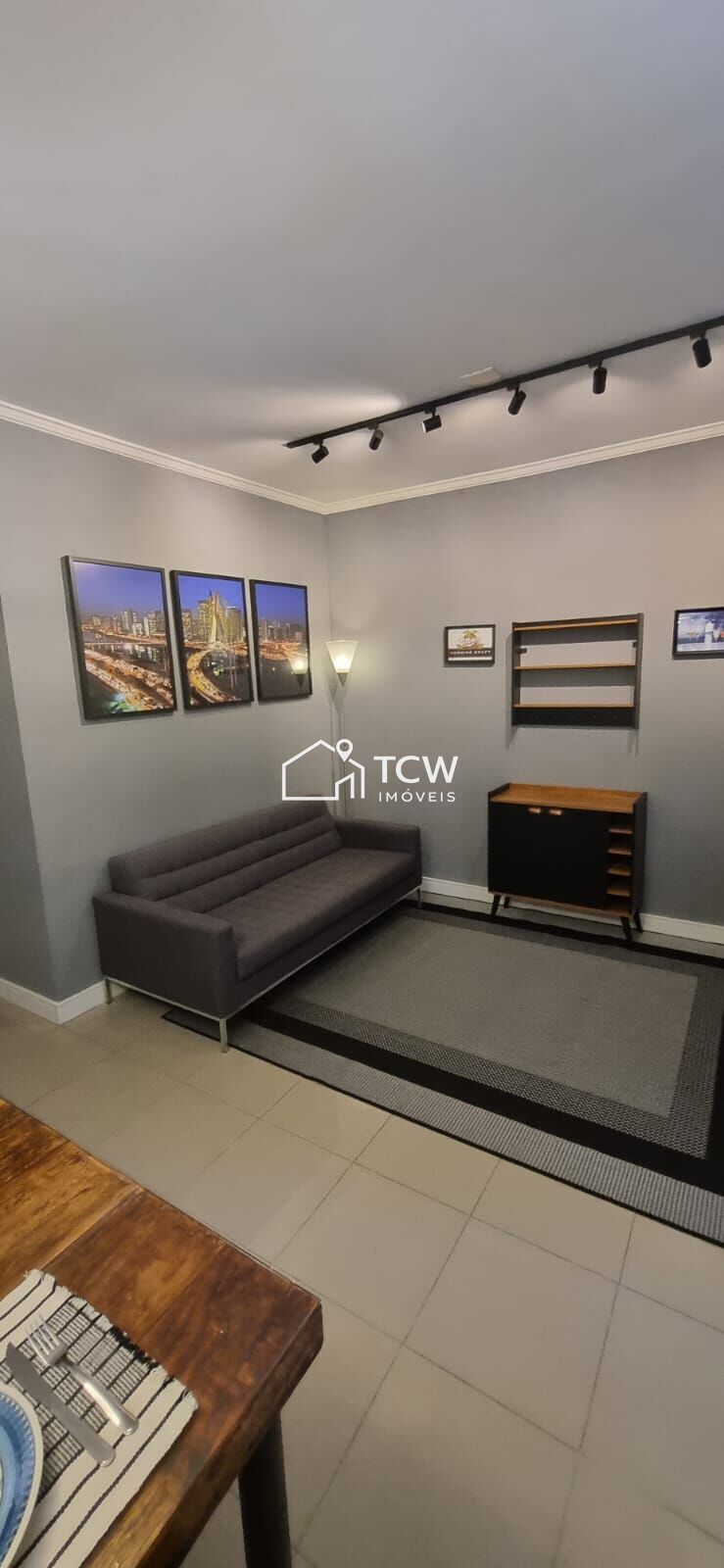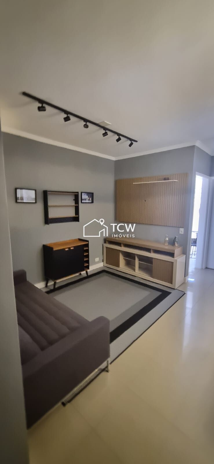 Living com sofá, TV Smart 43 polegadas, Iluminação com trilho elétrico com 6 spots, barzinho