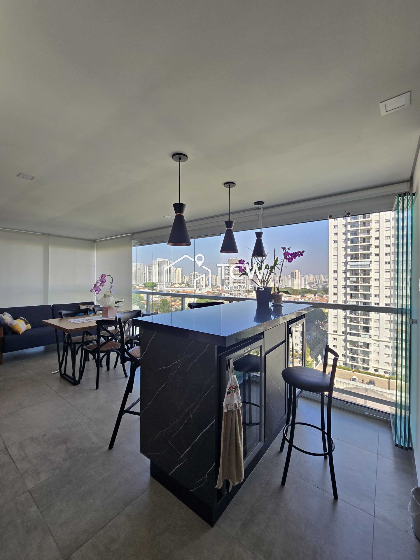 # Varanda gourmet com fechamento em vidro e persianas