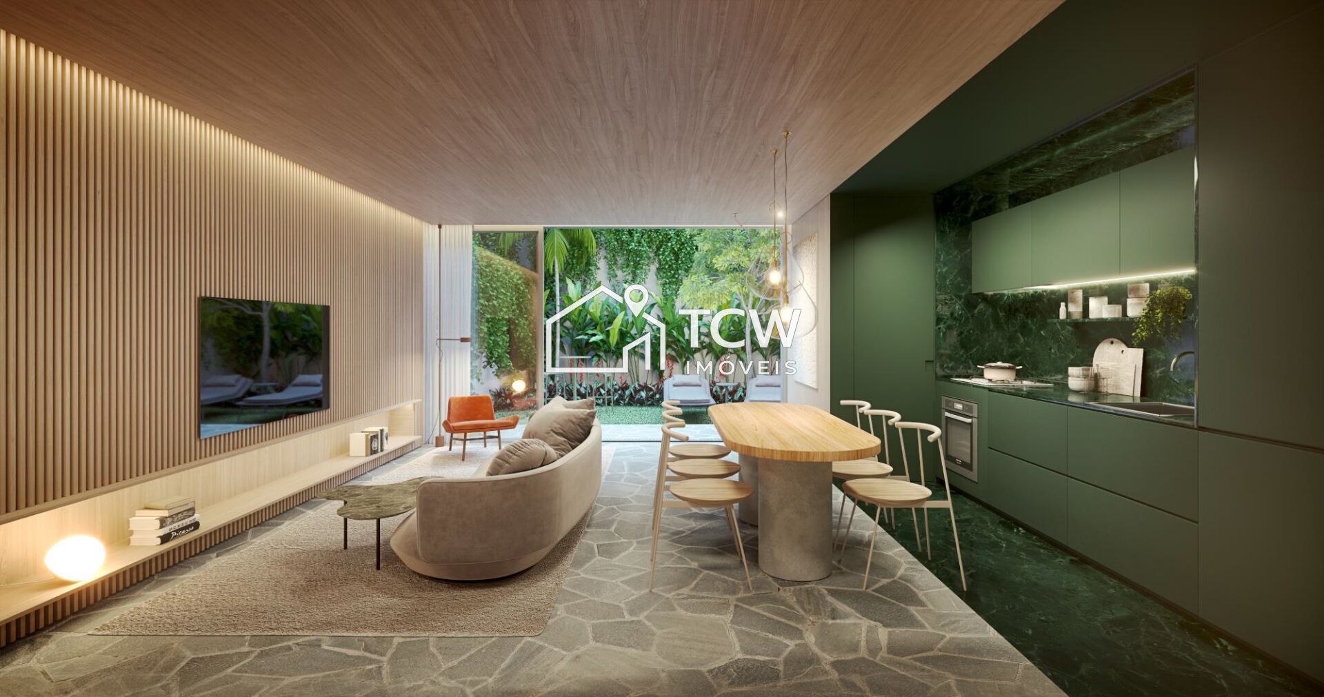 134m2, 2 Suítes, Lavabo, Living integrado ao jardim privativo, Sala de jantar, Cozinha, Área de serviço, Depósito privativo, 1 Vaga na garagem