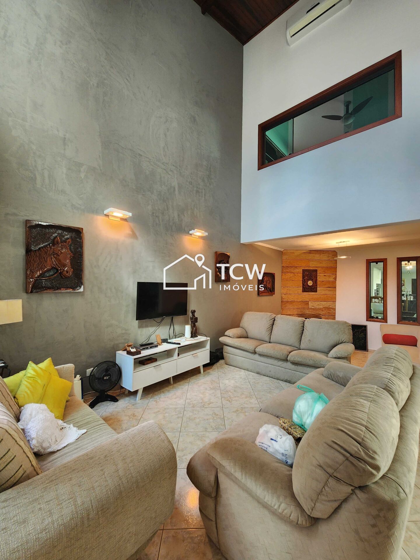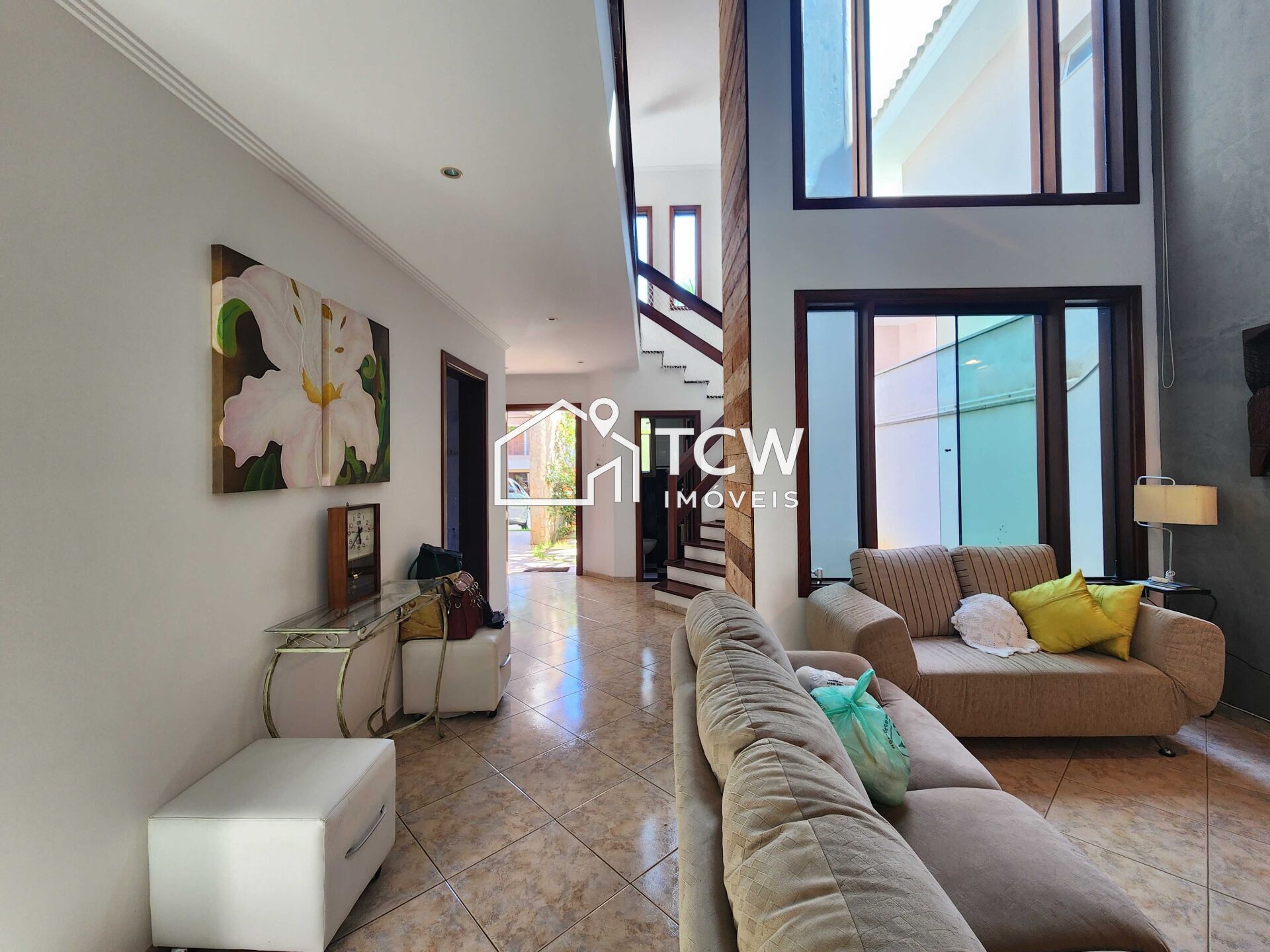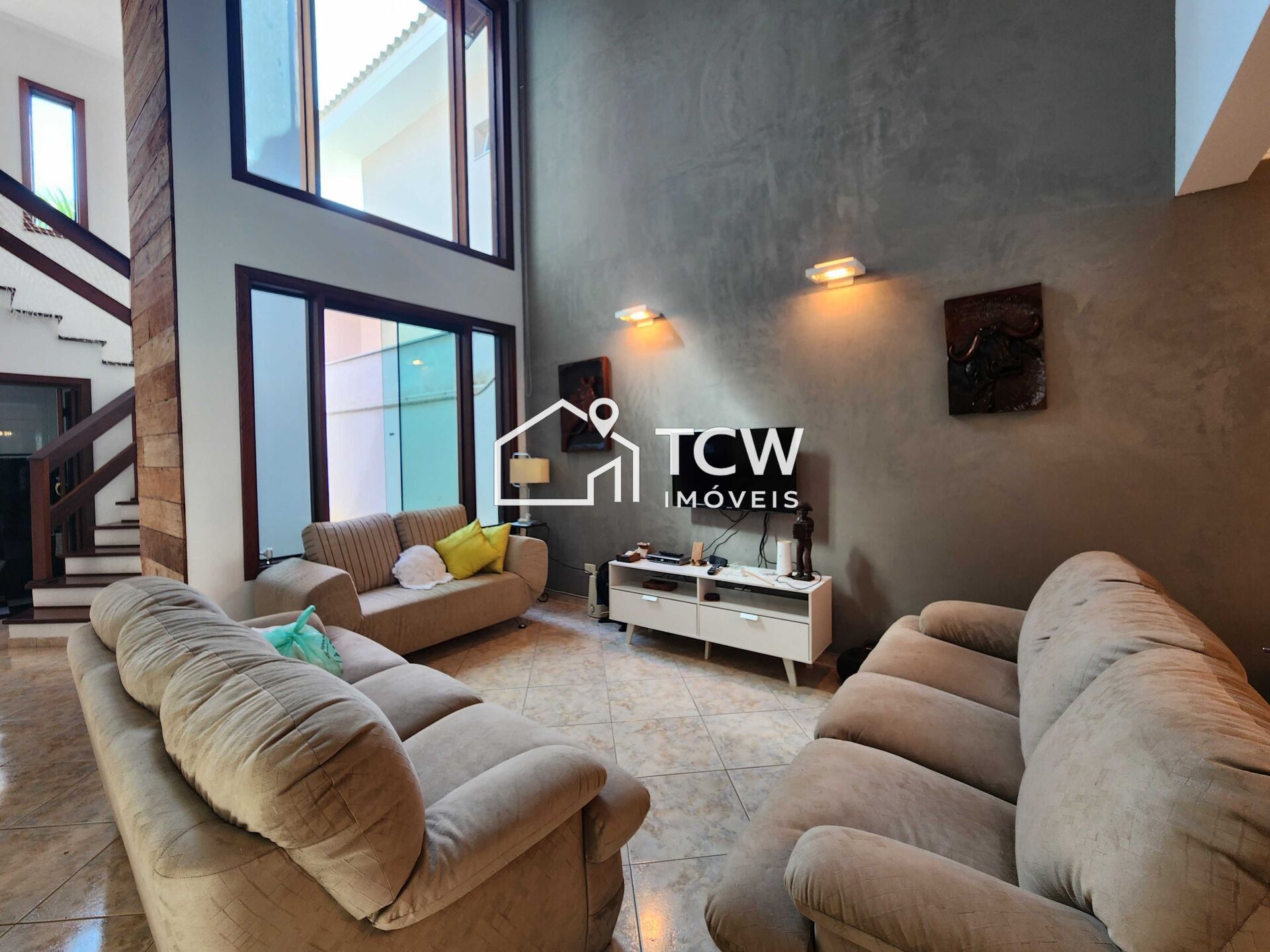 Sala de estar com pé direito alto, sala de lareira, lavabo, cozinha, sala de jantar;