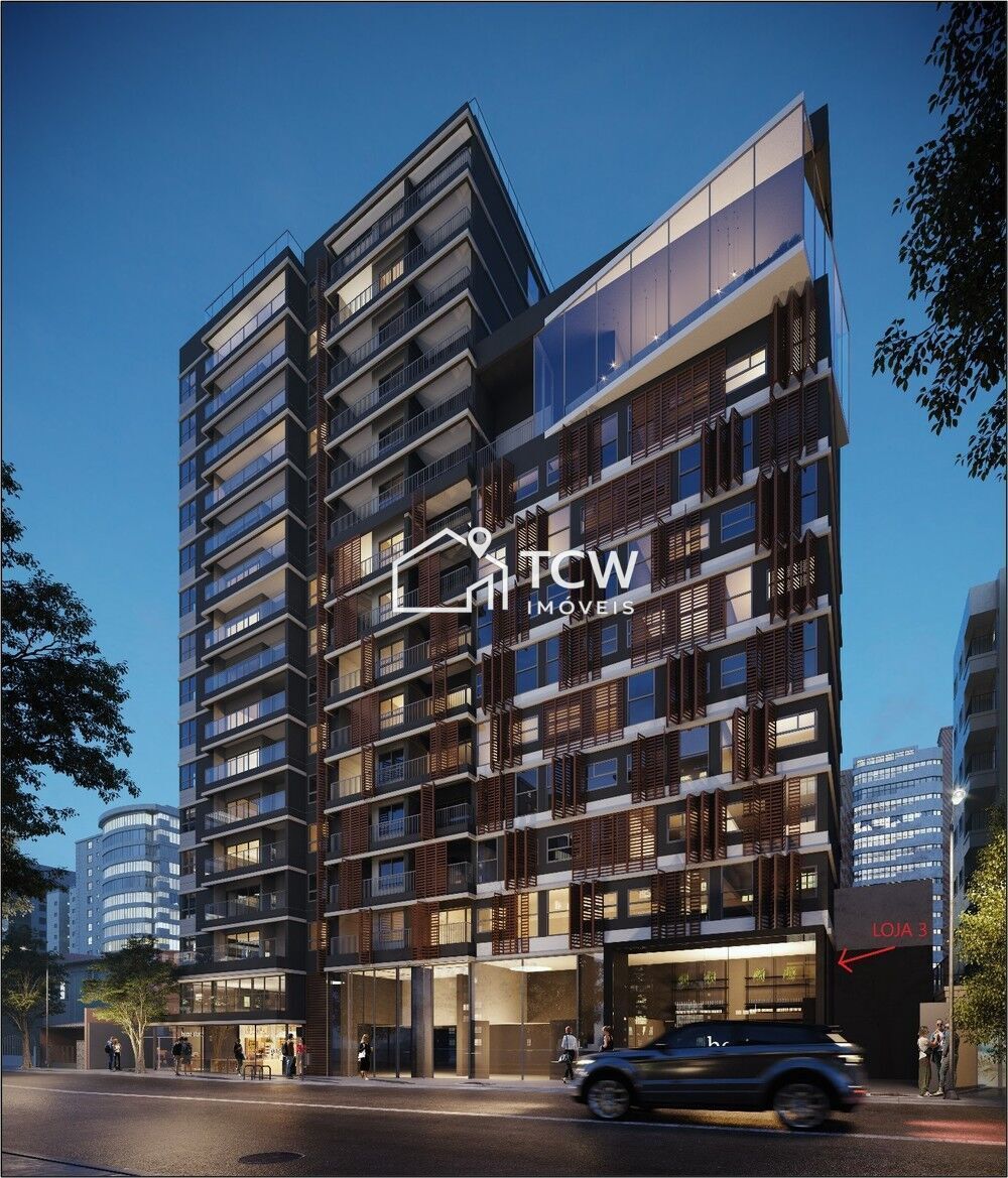 # Loja comercial com 1.329m2. 2 Andares, 2 Banheiros com piso em cerâmica branco, 1 Vaga para utilitário de uso compartilhado entre as lojas e apartamentos não residenciais/serviço de moradia