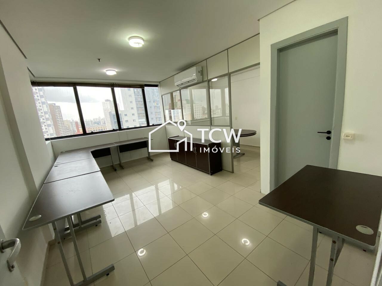 # Sala bem iluminada com divisórias e amplas janelas